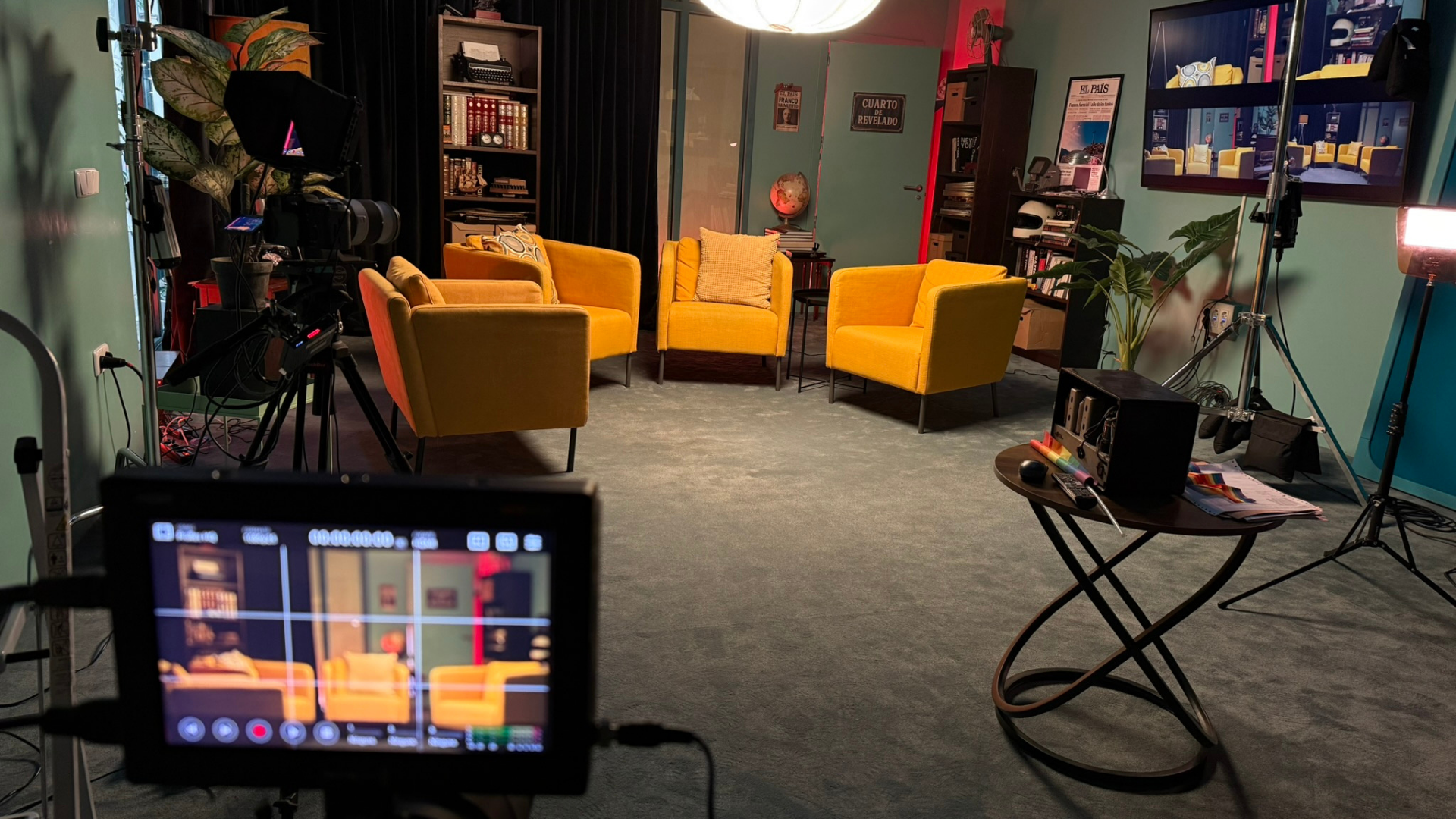 “El espacio está lleno de detalles. Recreamos un cuarto de revelado, y como se necesitaba una luz roja para no velar los negativos, pusimos un pavotube y dejamos la puerta sin cerrar. Además, colocamos luces prácticas, como lámparas, para resaltar otros lugares. El formato tiene mucho impacto visual. Si hay una cámara de 1920, una portada de El País de la muerte de Franco o una radio, hay que trabajar para que se vea”.