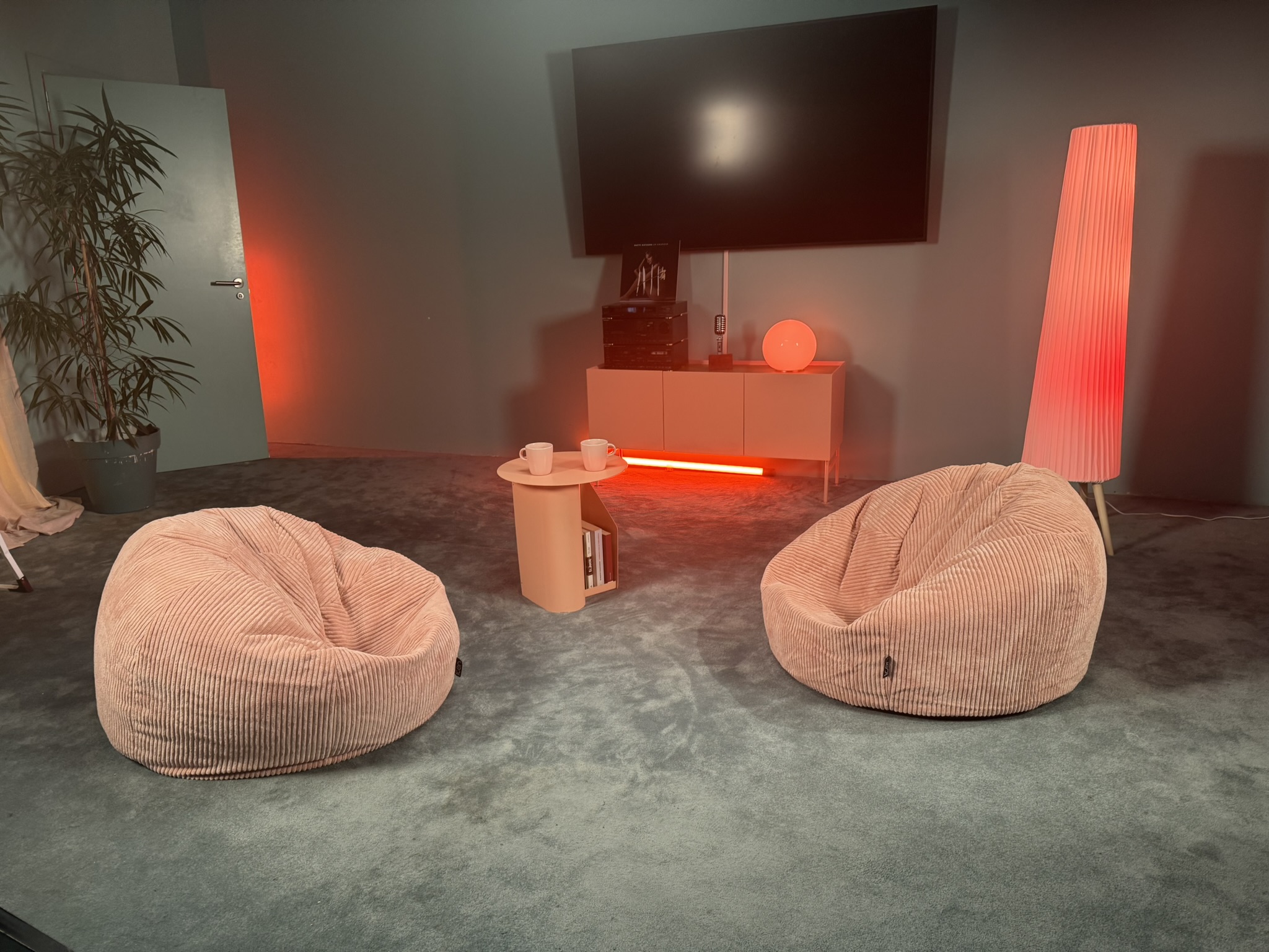 Toda la sala está ambientada con un color azul, aguamarina, paredes, alfombra, sillones... Y lo mejor de todo es que puedes elegir distintos planos para grabar, ya sea una pared de fondo y la redacción.